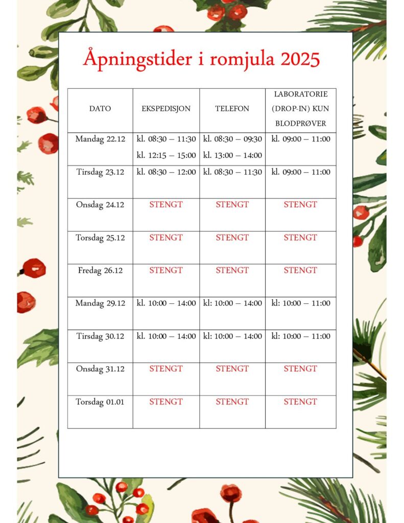 | LEGE | Mandag, 22.12.25 | Tirsdag, 23.12.25 | Onsdag, 24.12.25 | Torsdag, 25.12.25 | Fredag, 26.12.25 |